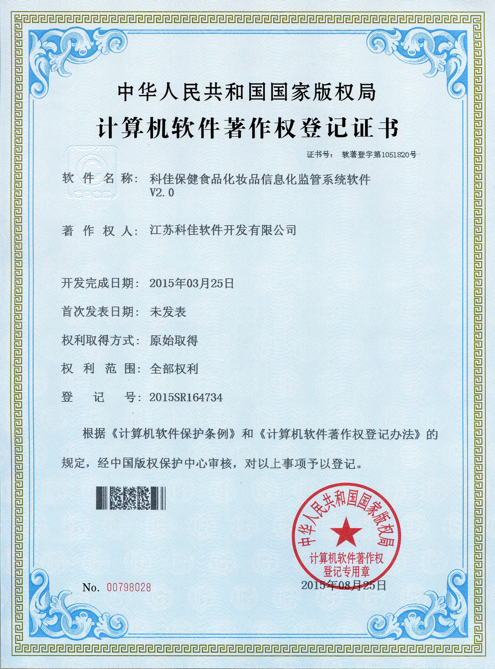 江蘇科佳軟件開發(fā)有限公司開發(fā)的“科佳保健食品化妝品信息化監(jiān)管系統(tǒng)軟件V2.0”在2015年8月25日成功獲得由中華人民共和國國家知識產(chǎn)權(quán)局頒發(fā)的計算機軟件著作權(quán)登記證書,證書號為“軟著登字第1051820號”。