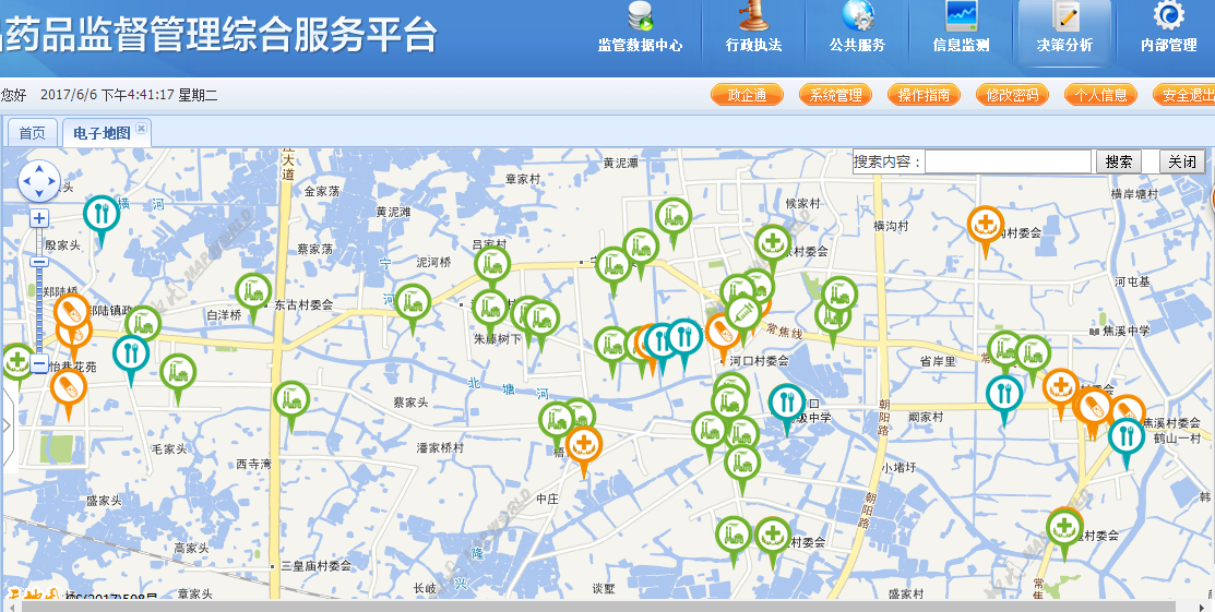 科佳公司研發(fā)的市局食藥監(jiān)綜合服務(wù)云平臺、數(shù)據(jù)資源中心庫的威力隨著系統(tǒng)功能越來越強大、隨著錄入數(shù)據(jù)種類越來越多、隨著監(jiān)管業(yè)務(wù)信息化越來越深入基層分局,GIS地圖結(jié)合各種業(yè)務(wù)數(shù)據(jù)的疊加一體化的展示就成為了現(xiàn)實,為下一步應(yīng)急指揮三級聯(lián)動體系的可視化指揮中心打好了扎實的平臺基礎(chǔ)。
